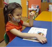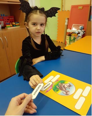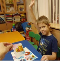 а) Ребенку последовательно демонстрируются карточки со слогами, из которых он должен составить слово. При этом каждая следующая карточка закрывает предыдущую. Начинать следует с двусложных слов, постепенно их удлиняя.